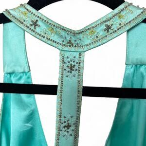 keywords: silk, beaded dress, aqua, halter, Laundry by Shelli Segal, formal, flowy, satin lined, bias cut, fairy, cottagecore, romantic dress, spring