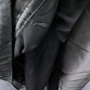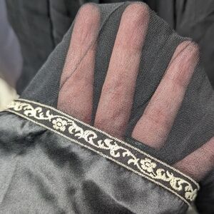 It is 100% silk material. It is fitted at the waist and flares out at the hips. It has spaghetti style straps. The skirt is a sheer overlay that is lined. The zipper is at the side. Please see photos for details.