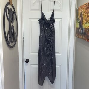 Laundry by Shelli Segal Silver Sequin Midi Ruched Dress, size 16. Excellent used condition. Back zipper. Adjustable straps. Asymmetrical hem. Lined. Gray and silver.
