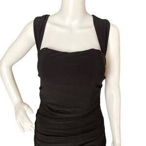 Stretchy bodycon dress has gathering at the side waist for a figure flattering fit.  Square neckline with crossback straps.