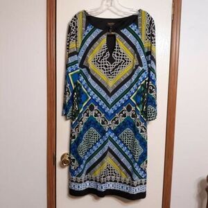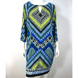 Shift dress with a bold geometric pattern in super soft knit. Dress is fully lined, three quarter sleeves and a pewter tone buckle sets off the keyhole neckline. Excellent condition. Blue, green & black w/ no issues.