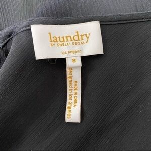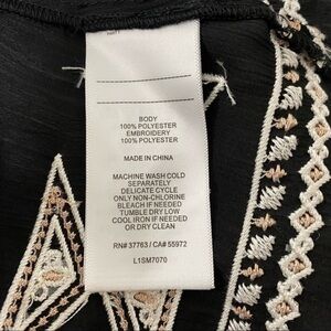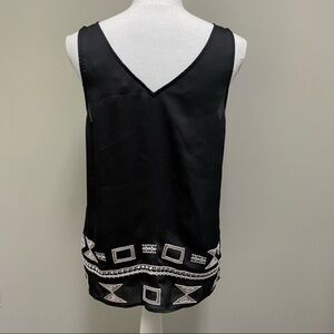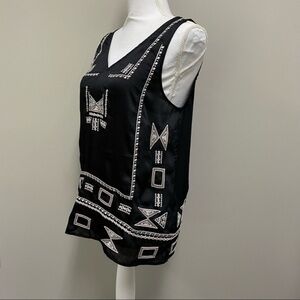 Tribal embroidery in tones of white and beige on black polyester tank, v-neck. Darts at bust for shape.