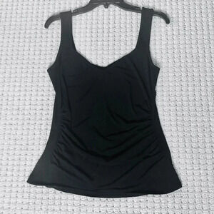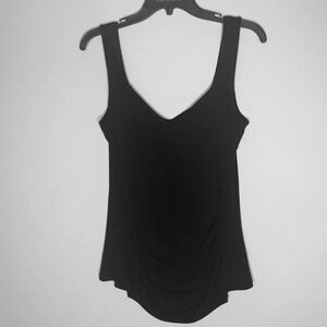 Black wide strap top with flattering front drape at the waist. Attractive v-neck both front and back. Soft polyester and spandex makes this top a classy dress or casual wear. Excellent used condition. Measurements in pictures. Size M.