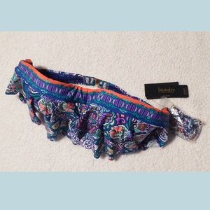 A really pretty Laundry by Shelli Segal Partridge bandeau bikini top with flounce overlay at the front! Can be worn with or without the 2 straps it comes with. (The baggie that holds the straps was opened once.) Has a sweetheart neckline, back hook closure, and molded cups with underwire. Thanks to its multi-colored pattern, this top would look fantastic with a variety of colored bottoms! NWT and size Large