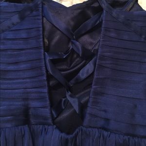 This navy colored cocktail dress has a beautiful lace up back. It is a very form fitting dress that slightly flares at the bottom. Worn for a dinner party twice! Excellent and beautiful condition and very sad to part with it. I'm just no longer a size 2!!