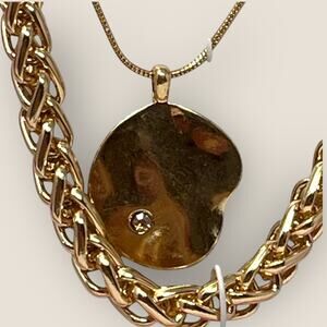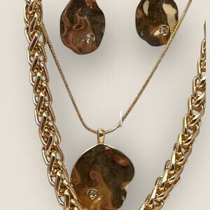 New in box jewelry set by Laundry by Shelli Segal. Two gold tone necklaces and matching drop earrings. Organic hammered disc pendant and earrings with clear crystal accent. Chunky woven link chain and sleek snake chain. Original floral gift box included.