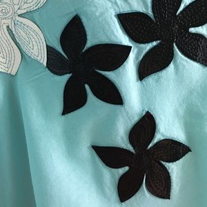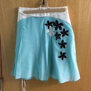 Aqua and white lightweight skirt with white cord/belt attached. Black and white vinyl floral detail.