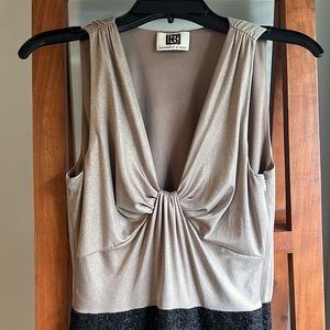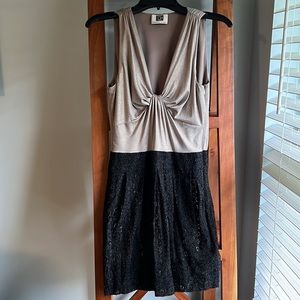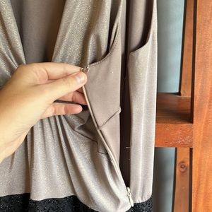 Beautiful Laundry dress! I’m only selling because its gotten tight. Fabric and size tag has been removed. Fits like the other size 6 dresses I’m selling. See measurements for details. Spandex material on the inside that stretches. Metallic top with lace bottom. Side zipper.