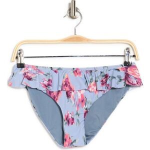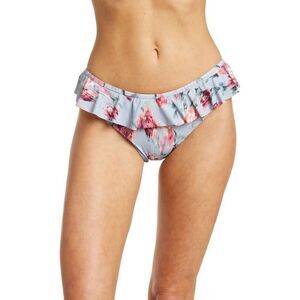 An abstract floral print and ruffled trim bring feminine style to this cute hipster bikini bottom.