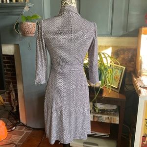 Excellent condition wrap dress in nay and white abstract design. Size is XS. See photos for details and measurements. Be sure to ask any questions prior to purchase. Thank you 😊
