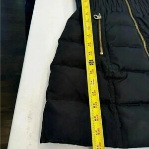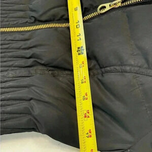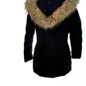 Excellent condition. The coat is black with a faux fur lined hood. Full zip front, gold hardware. See photos for measurements
