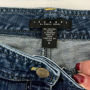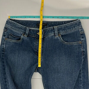 Excellent pre-loved condition, faux leather design on back pockets. Straight leg or slight boot cut.