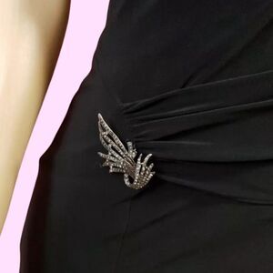 Gathered with crystal and silver tone metal medallion that is sewn into the dress.