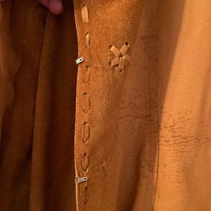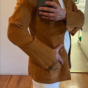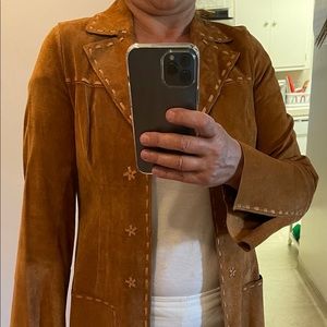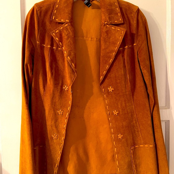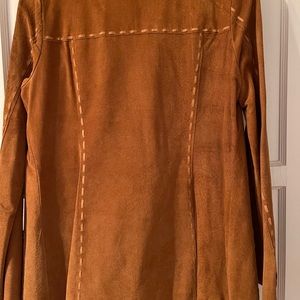 Laundry suede jacket in cognac color , hook& eye closure, 2 pockets ,long sleeves with slit ,hand stitching leather details , pig skin assembled in Mexico, parts from USA , no lining, very light weight.pre owned, no rip or tears.