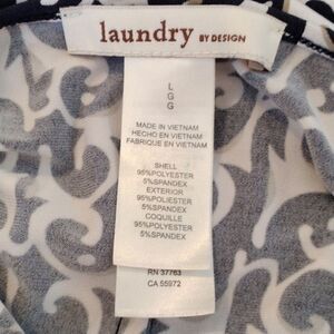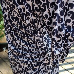 Arabesque graphics in black and white with taupe accents. Wrap Front . Ruching at waist in left creates a flattering silhouette. Love ng sleeves with elastic ruching at sleeve end. Size L measures 40 at chest, 32 at waist, 42 at hips. 40 long from shoulder to hem. This is a beauty, perfect for work.
