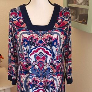 This is a comfy shift dress has bold graphics and colors. Mildly patriotic, but great for any summer day. Squareish neckline. Trim at sleeve end. Size M measures 44 at chest, 42 at waist, 44 at hips. 37 long from shoulder to hem. Have a little fun with this one.