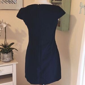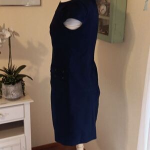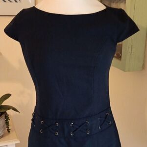 Sweet little sheath dress. Very deep navy blue. Cap sleeves. Princess seams. Slightly dropped waist. Woven laces at lower waist. Back zip. Size 4 measures Size 4 measures 34 at chest, 32 at waist, 36 at hips. 32 long from shoulder to hem. Super cute and great for work.