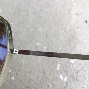 Super cute, sunshade sunglasses. No scratches on the lenses (2.5), frames are gray that fade. Measuring on the inside by the legs is 5.5 inches
