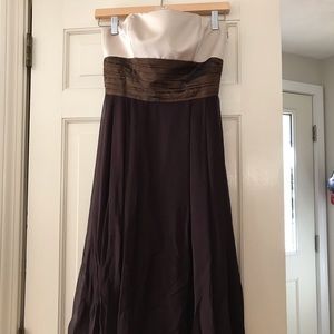 Brown and cream cocktail dress with bow in the back. Skirt flows beautifully - great for dancing. Small spot on bodice (pictured). Worn once.