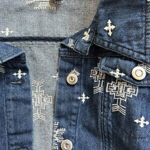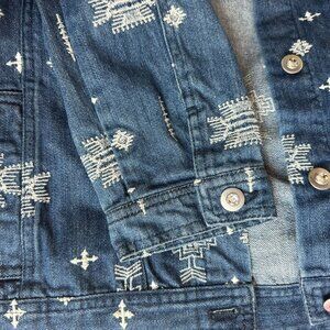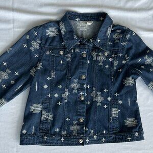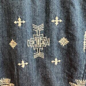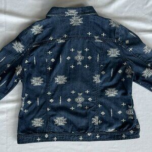 Laura Ashley jean jacket with white, stitched Southwest design elements on front and back. Like New condition with no signs of wear - no stitching coming out, stains, dirt, fading, button scratches etc.