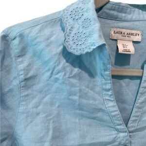 Laura Ashley Blue Linen/Cotton Button Blouse Lace Eyelet Collar Sz S Cottagecore/Fairy🩵