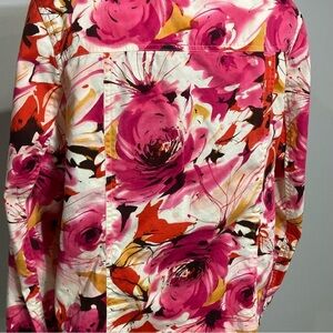 Laura Ashley Woman beautiful bright pink floral shacket. Button up, faux pockets in the front, button cuffs. Stretchy and comfortable. Size 1X, measures 22.5” PTP. Excellent preowned condition!