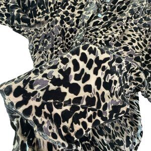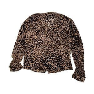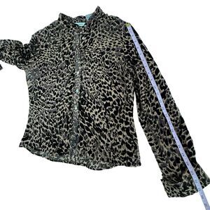 Brown chiffon and velvet burnout animal printed, long sleeve blouse with flip cuffs.