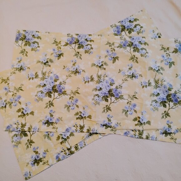 Set of 2 Laura Ashley pillow cases in the Cassidy pattern. King size. Excellent condition with no rips, holes, or stains. Classic blue and green floral pattern on a yellow backdrop. Back of the shams are a blue and white plaid/check with envelope enclosure. Coordinating Euro shams (featuring the plaid/check on front and back) are available in another listing! An English country, cottagecore, grandmillennial dream!