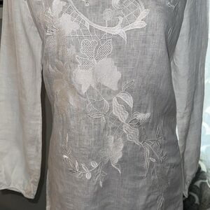 Stunning Laura Ashley embroidered linen Tunic. Size 4. Measures 18” across the chest, 30” long & has 23” long sleeves.
