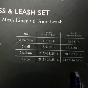New dog harness and leash for large dogs. Sizing chart is visible in the photos.