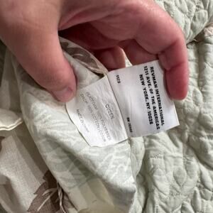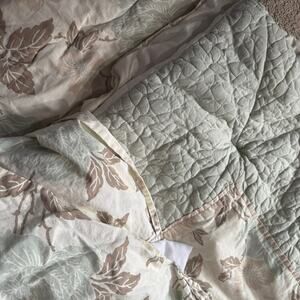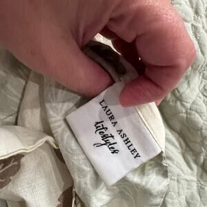 Laura Ashley Lifestyles Queen Size Muted Florals Comforter & 2 Pillow Shams. Very light greens, cream, browns, bedding, blanket. Comforter has a small, worn area with a little hole and a couple areas with small ink pen marks. Comforter is otherwise in good used condition with no other issues. Lots of wear left in it, and blanket is still in good, usable condition. Please see close-up pictures for condition details.