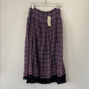This stunning maxi skirt by Laura Ashley features a beautiful blend of purple and black tones, perfect for casual or resort wear. Its A-line silhouette is enhanced with pleated and tiered details, offering a graceful flow and movement. Crafted from a lightweight fabric, this skirt is both stylish and comfortable for any relaxed occasion.