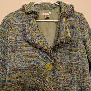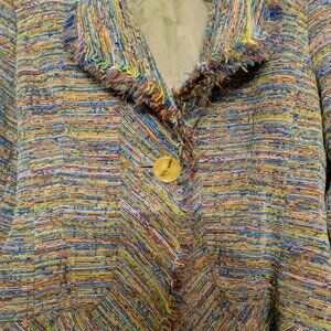 This jacket combines a beautiful multicolored tweed texture with a unique fringed finish. Its single button closure adds convenience, while the tailored design creates a stylish silhouette. The collar showcases subtle yet vibrant detailing, making it an elegant addition to your wardrobe. The jacket's timeless design suits various occasions with effortless sophistication. Women's size small.
