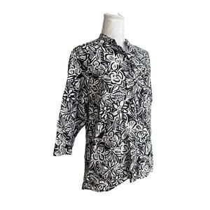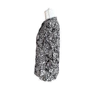 Laura Ashley Petite black and white floral shirt in 100% linen. Features embroidered botanical pattern, button front, and lightweight breathable fabric. Collarless neckline and relaxed fit. Tag reads Women’s Petite Medium—please refer to measurements.