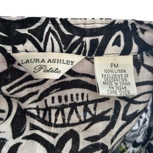 Keywords: laura ashley linen shirt, petite floral blouse, embroidered linen top, black white botanical, cottagecore fashion, size PM
