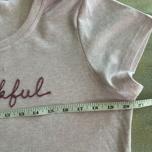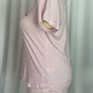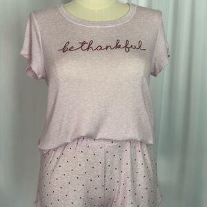 Experience ultimate relaxation with the Laura Ashley pajama set, featuring a soft pink top adorned with 'be thankful' in elegant cursive. The lightweight fabric and matching polka dot shorts offer a cozy fit, ideal for lounging or a peaceful night's rest.