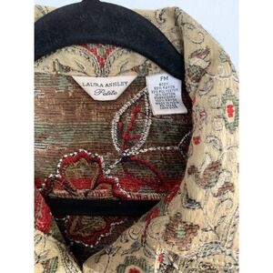 Vintage Laura Ashley Tapestry Jean Jacket Size Petite Medium. Preowned good condition! Has sequins on the front. Body- 55% rayon 33% polyester 12% cotton. Embroidery 100% rayon. 20 in pit to pit, 22 in top to bottom: ships in 1-2 days 🌅