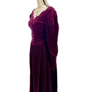 AMAZING burgundy velvet dress by Laura Ashley. The dress features a unique pleated drop waist design with loop buttons, puff sleeves, and a scalloped neckline. The long dress is made of a cotton polyester blend and has a solid pattern with a vintage touch.