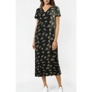 Timeless and elegant, this vintage Laura Ashley dress is crafted from luxurious 100% silk. Featuring a relaxed Maxi (depending how tall you are) silhouette with short sleeves and flattering V-neckline, this piece drapes beautifully and offers effortless style. The dress comes in a deep hunter olive green shade, accented with a subtle cream palm print for a natural, earthy vibe.