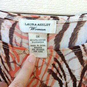 Up for sale is a vintage Laura Ashley Woman blouse in a size 3X. This top features three-quarter lenght sleeves and a vibrant animal print with a mix of zebra and tiger stripes in warm, earthy tones. It is very lightweight and stretchy. It's smooth to the touch, too. It's in nice shape with no stains or holes. This top can be worn for lots of occasions from work to a casual party. Thanks for looking!