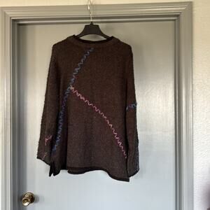 Large button/snap front closure. Very soft acrylic/wool/mohair blend. Colorful yarn embroidery.