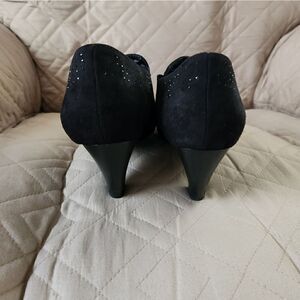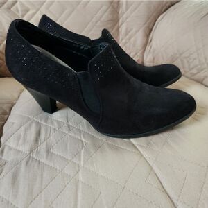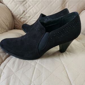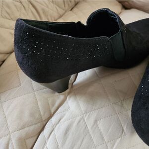 Laura Ashley black faux suede slip on leather ankle bootie with 3" heel and rhinestone embellishment. women's US size 11 M in box