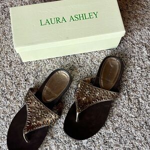 Step out in style with these Laura Ashley sandals, featuring chic brown and gold metallic with beaded design. Perfect for any occasion, these sandals offer both comfort and elegance.