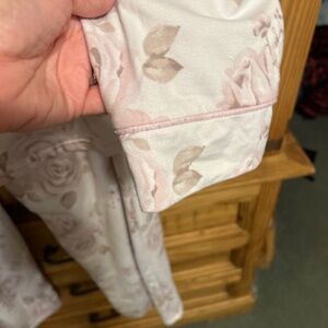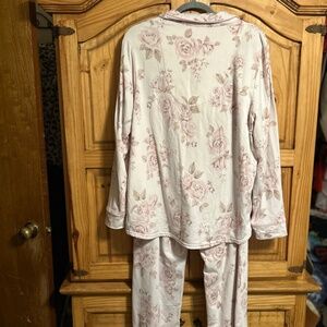 Good condition. Size XL. Floral print. Bottoms has elastic waist. Top buttons down and has 1 pocket on left. Had pink piping around cuffs and around collar and down front. Pajamas are white with light pink roses. Measurements are pit to pit 25 and 27 inches long for top and bottoms are 40 inches long and waist is 17 inches across and has elastic. 95% polyester and 5% spandex.