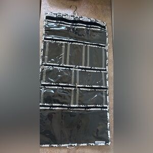 Laura Ashley hanging toiletry travel pack with nine compartments of various sizes with zipper closures.