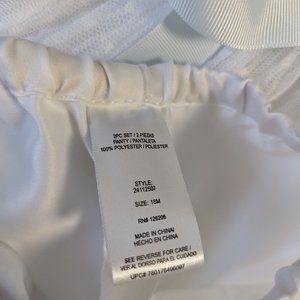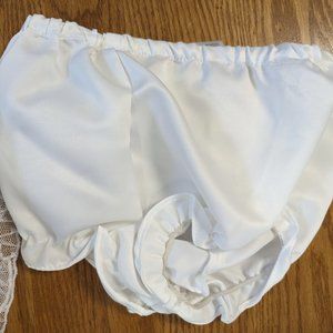 Full white skirt with lace overlay and light blue ribbon tie at empire waist. Comes with silky elastic waist bloomers. Sz 18 m NWT