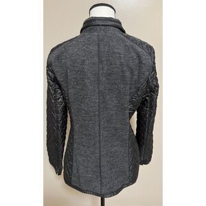 Wool blend gray-black fabric with black quilted arms and side inserts