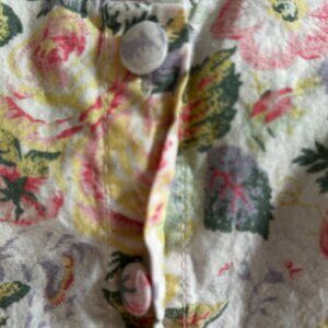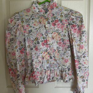 Very good used condition from a smoke free home with no stains or discolorations. Love it but ready for change Pink & dove blue flowers printed on white cotton poplin. In photos (which I plan to update soon in better light) they might look like spots but are actually part of this gorgeous pattern. Please be advised that this 100% cotton blouse does not have a lot of stretch and is form fitting for a size 4 to call flatter an hourglass silhouette. High neck ruffle collar and ruffles at the bottom hem and sleeves in a soft cotton give a Prairie or Western edge to whatever you want to combine it with. Wear top buttons opened at top or buttoned. I wear with barrel shaped light wash barrel Levis and Air Jordans when I want to be more casual or paired with boots for a more Western vibe. I've also worn with muted green pin stripes and chunky heels, fitted denim skirts, a white mini athletic skort and cargos