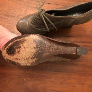 There is wear on the soles and some scuffing/scratches (see photos), they are a textured gray leather. The sole on the right shoe looks like it's been glued on, there is some glue on the side (see photos). Otherwise good condition.
