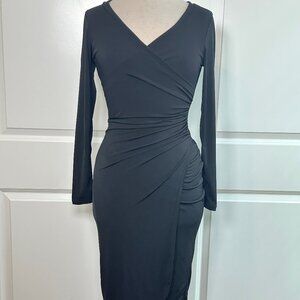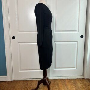 Gorgeous 3/4 sleeve retro-inspired black dress. Gathers at the left side of waist, showing just a bit of leg on the same side, for a sexy fit. Size Small. 94% polyester 6% spandex, feels soft and comfortably hugs the body. Owner is 5"8' and 120lbs, dress dummy adjusted to owner height for length comparison.